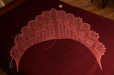 All done, un-blocked in it's "cat yack" stage. I had to use a contrasting merino lace yarn to bind off the edge because I ran out of the main yarn.